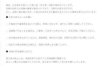 町内では、防犯灯や防犯カメラの設置、非常用物資の備蓄など、安全対策を行っております。