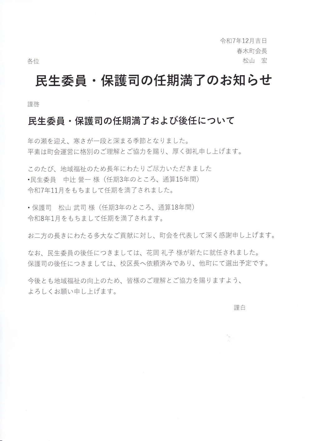 民生委員・保護司 任期満了のお知らせ